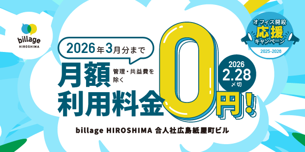 2026年2月までに広島のシェアオフィス「billage HIROSHIMA 合人社広島紙屋町ビル」の所定のレンタルオフィスプランをご契約の方に限り、管理・共益費を除いた月額利用料金が0円になるキャンペーンです。