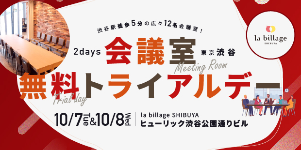 2025年10月7日(火)&8日(水) 両日10:00~19:00 | 会議室無料トライアルデー | 【東京|渋谷】la billage SHIBUYA ヒューリック渋谷公園通りビル |