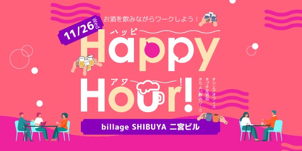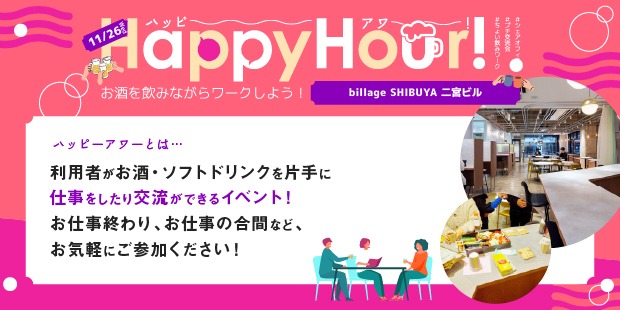 2025年11月26日(水)に、billage SHIBUYA(ビレッジ渋谷) 二宮ビルにて、「ハッピーアワー」を開催いたします!