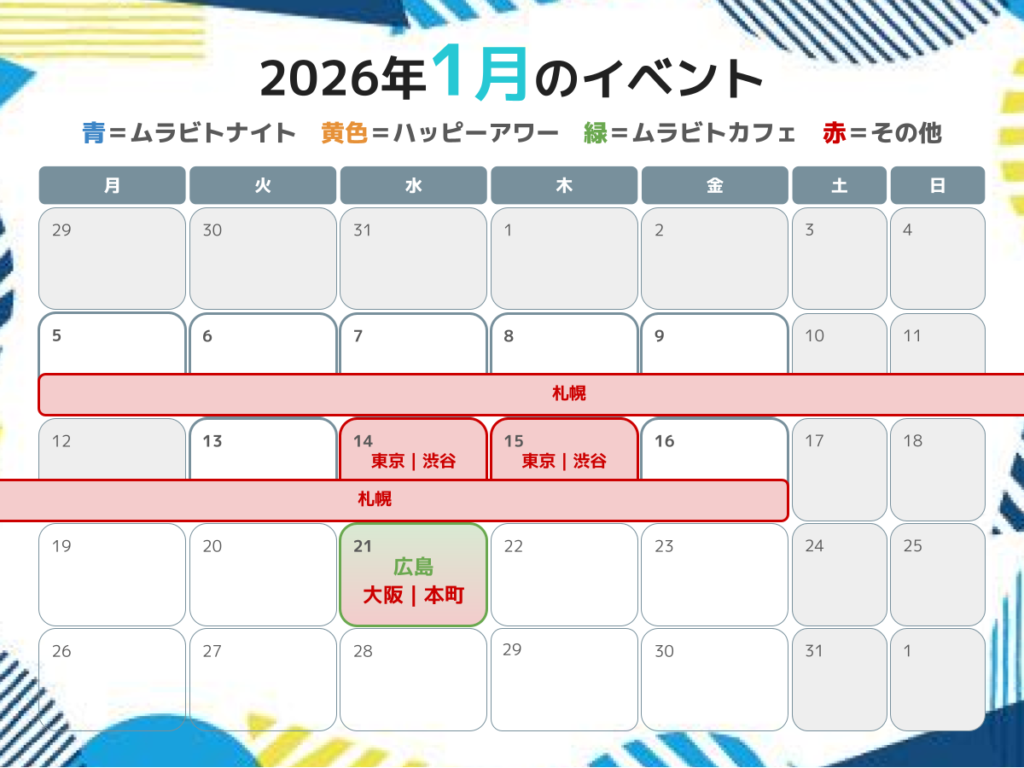 | 2026年1月15日(木) 17:00~18:00 | ムラビト新年会 | 【東京|渋谷】la billage SHIBUYA ヒューリック渋谷公園通りビル |
