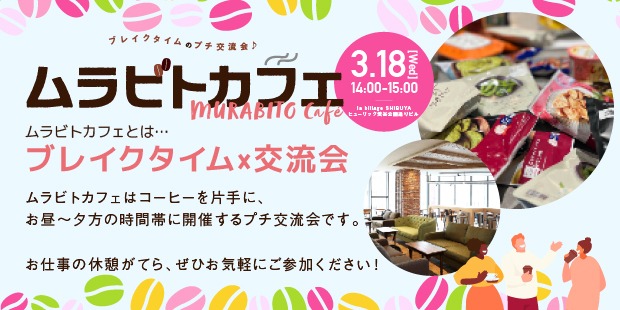 2026年3月18日(水)に、la billage SHIBUYA(ラビレッジ渋谷) ヒューリック渋谷公園通りビルにて、会員同士の交流会「ムラビトカフェ」を開催いたします!