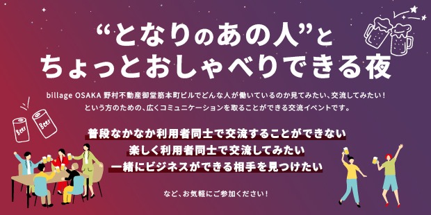 billage OSAKA 野村不動産御堂筋本町ビルでどんな人が働いているのか見てみたい、交流してみたい!という方のための、広くコミュニケーションを取ることができる交流イベントです。