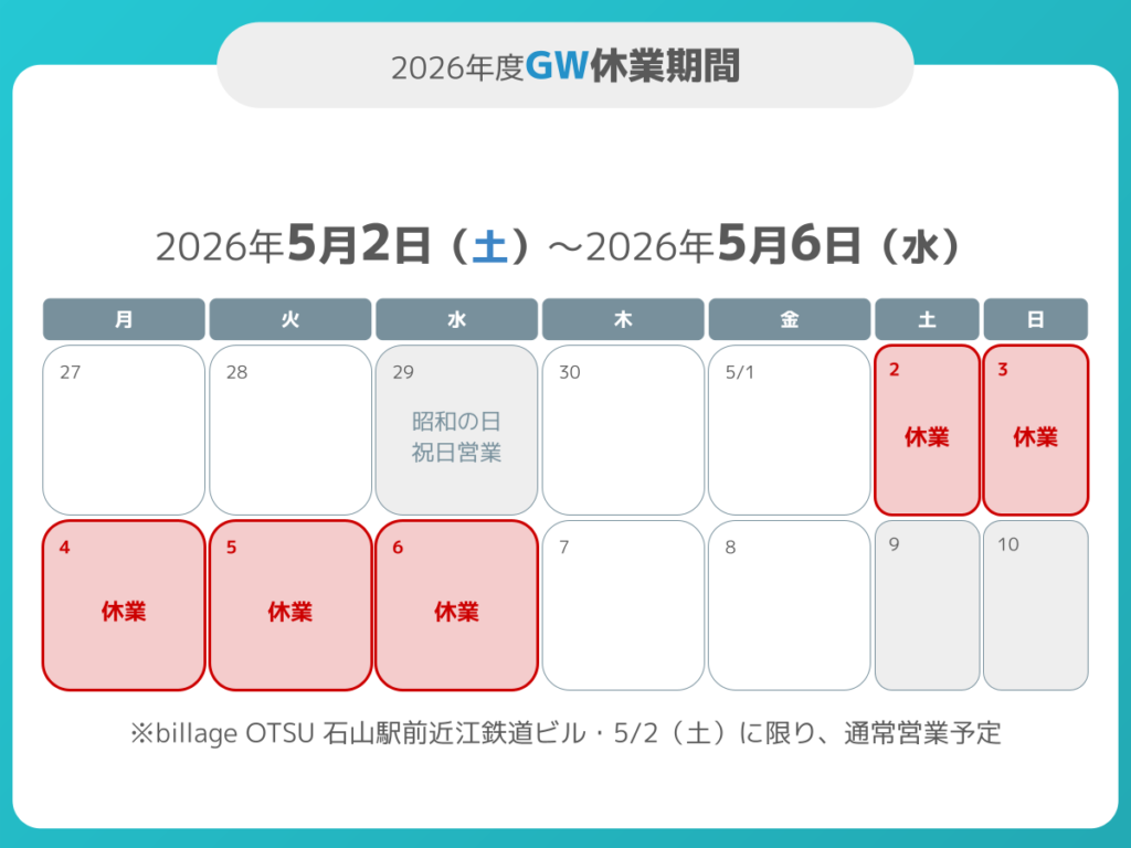 ※【大津】billage OTSU 石山駅前近江鉄道ビルのみ、5月2日(土)のみ通常営業予定です。