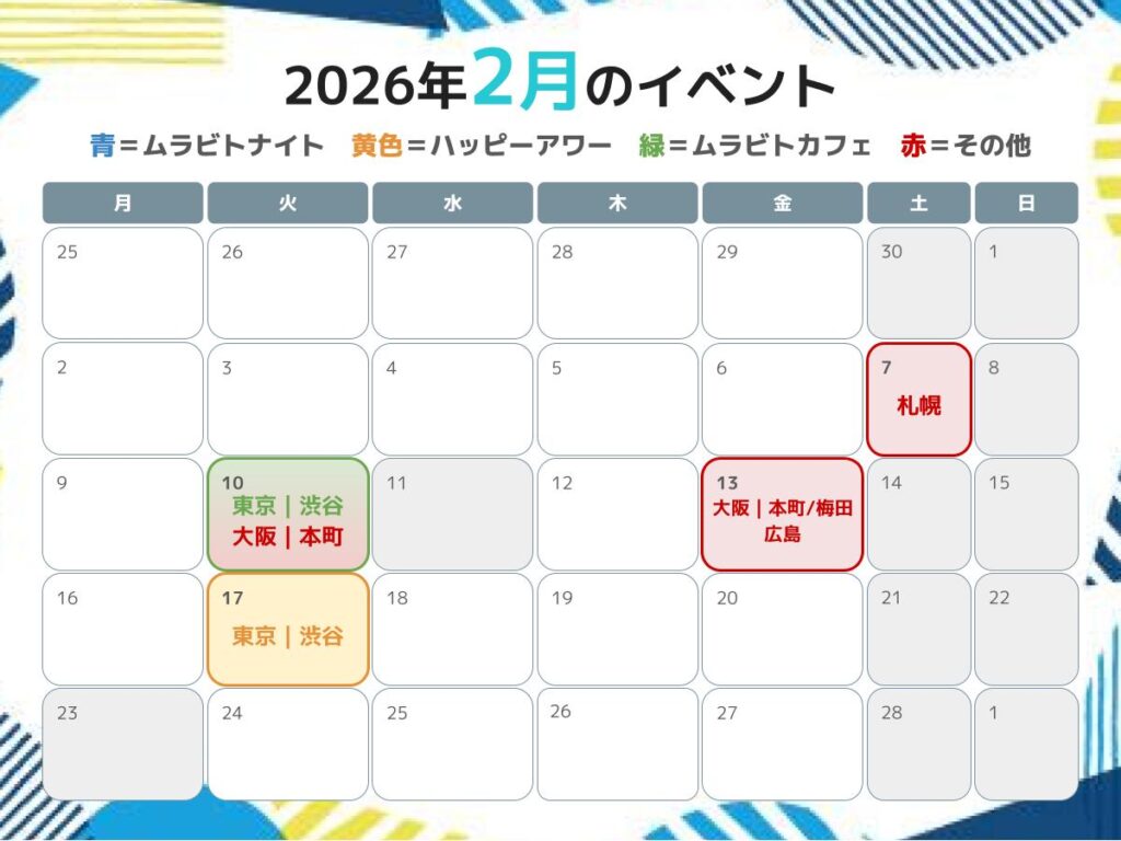 | 2026年2月13日 (金) 14:00~15:00 | ムラビトカフェ~バレンタインスペシャル~ | 【広島】billage HIROSHIMA 合人社広島紙屋町ビル |