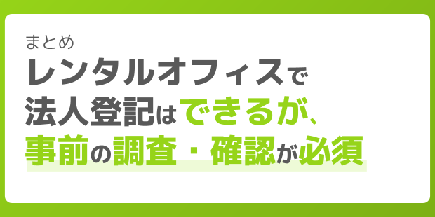 たとえば、レンタルオフィスの運営会社に確認の上、法人登記の許可があると確認できた場合は法人登記できます。レンタルオフィスによっては公式サイトや資料で明記していないところもあるので、その場合は直接問い合わせて確認する必要があります。