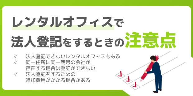 一方、レンタルオフィスの運営会社によっては法人登記を許可していないところもあるので、レンタルオフィスで法人登記の申請をしたい人は注意が必要です。