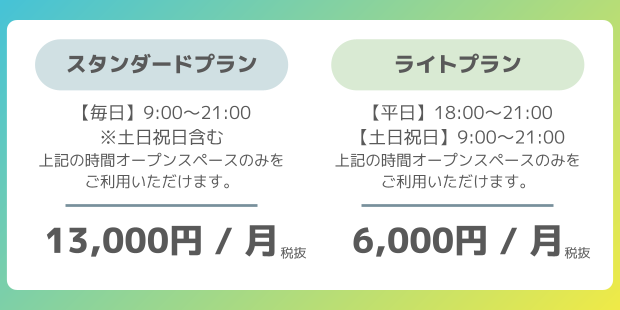 月額プラン概要 | ■ライトプラン|月額6,000円(税抜) 平日18:00~21:00、土日祝日9:00~21:00に施設利用が可能なプラン ■スタンダードプラン|月額13,000円(税抜) 曜日問わず毎日9:00~21:00に施設利用が可能なプラン |