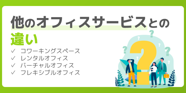 | コワーキングスペースとの違い | レンタルオフィスとの違い | バーチャルオフィスとの違い | フレキシブルオフィスとの違い |