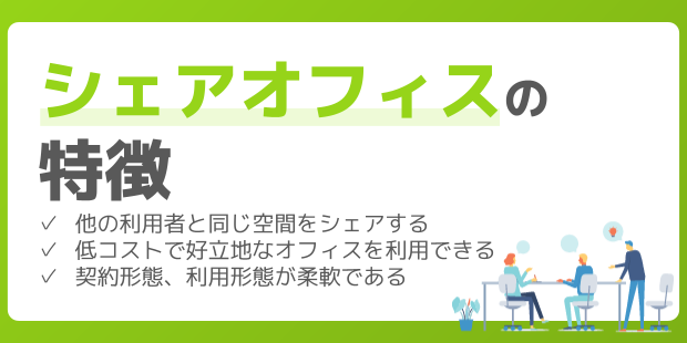 シェアオフィスの特徴は、他の利用者と同じ空間をシェアして働くことができる、低コストで好立地なオフィスを利用できる、契約形態、利用形態が柔軟であるという点です。