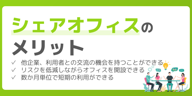 シェアオフィスは第三者とワークスペースを共有し、契約形態が柔軟であることから、他企業、利用者との交流の機会を持つことができる、リスクを低減しながらオフィスを開設できる、数か月単位で短期の利用ができるという点が大きなメリットといえます。