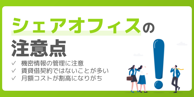 柔軟に低コストで利用できるのが魅力的なシェアオフィスですが、利用するときには、機密情報の管理方法や、賃貸借契約に基づかないこと、月額コストが割高になりがち、などの点に注意が必要です。