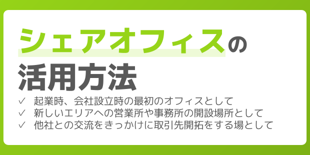 シェアオフィスに向いているおすすめの活用方法は、起業時、会社設立時の最初のオフィスとして、新しいエリアへの営業所や事務所の開設場所として、他社との交流をきっかけに取引先開拓をする場として、などです。