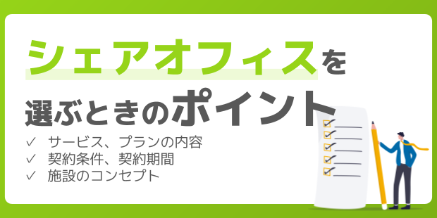 シェアオフィスは運営会社によって様々な特徴があります。数あるシェアオフィスの中から自分に合う最適なサービスを探すためには、サービス、プランの内容や契約条件、契約期間、そして、各施設のコンセプトをチェックすることをおすすめします。